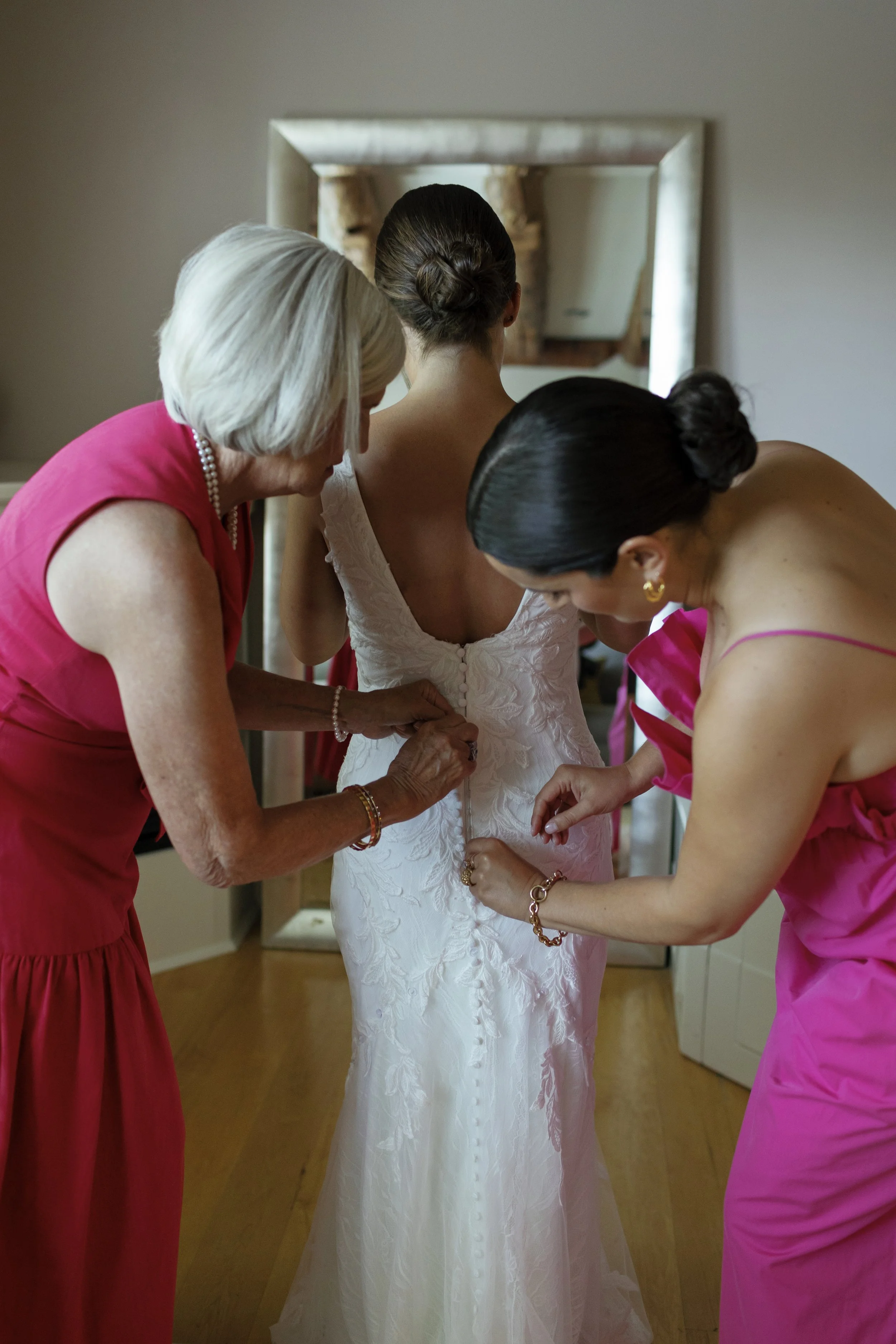 An elderly woman and a young woman in pink dresses assist a bride with her wedding dress in a room with a mirror in the background.